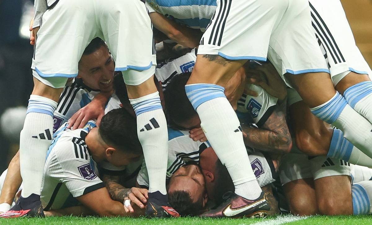 VŠEMI ZBOŽŇOVANÝ. Lionel Messi je zavalen svým týmem poté, co ve finále šampionátu proměnil penaltu po faulu na Di Maríu.
