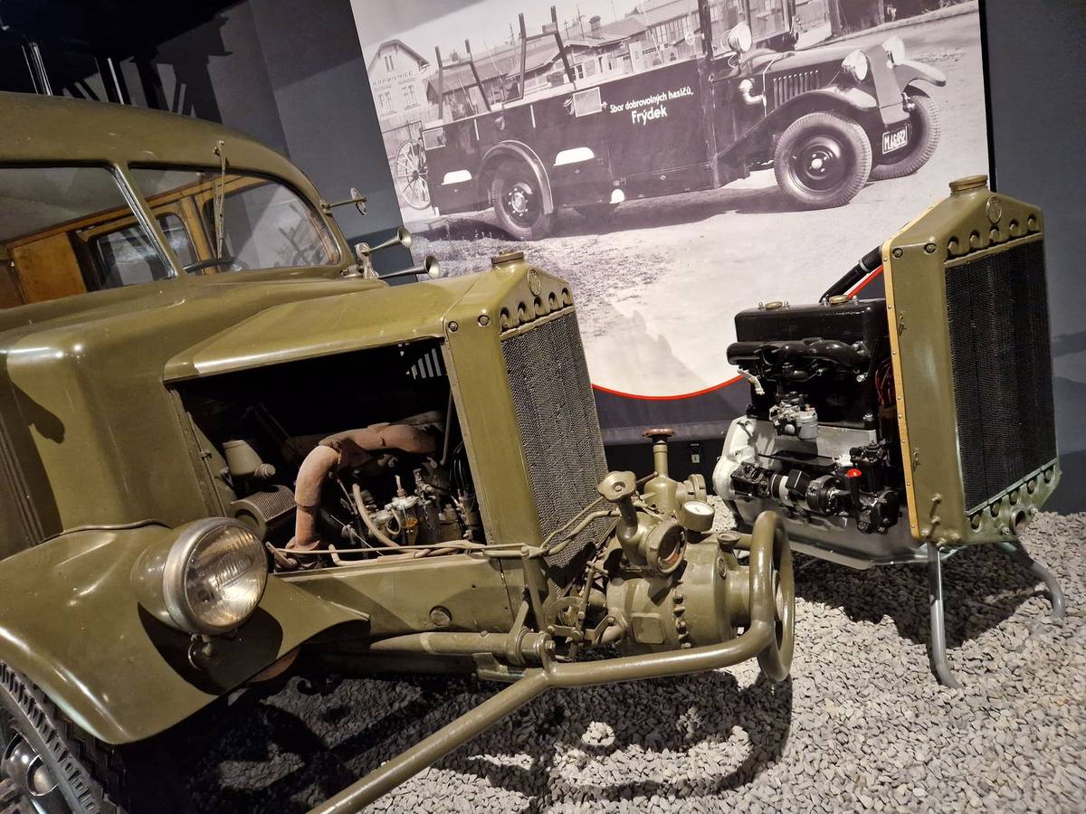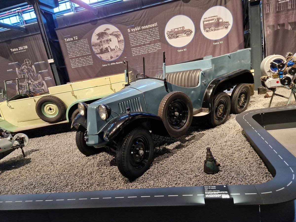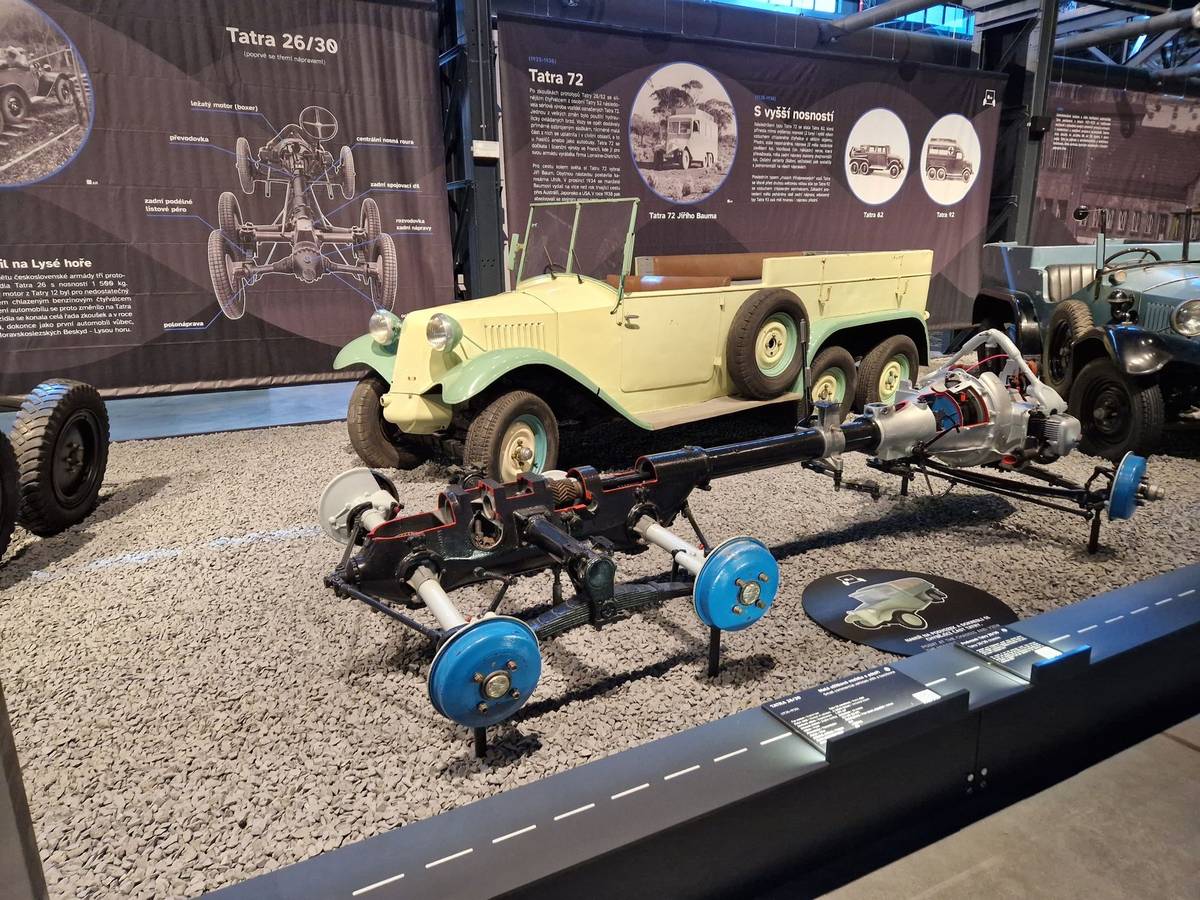 V muzeu je k vidění i spousta podvozků. Třeba tento třínápravový patří Tatře 26/30 s motorem typu boxer vpředu a až do 60. let sloužil jako učební pomůcka. Nyní je tedy v muzeu. V pozadí pak exemplář Tatry 72.