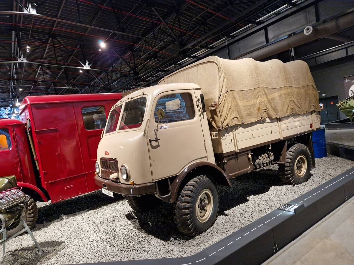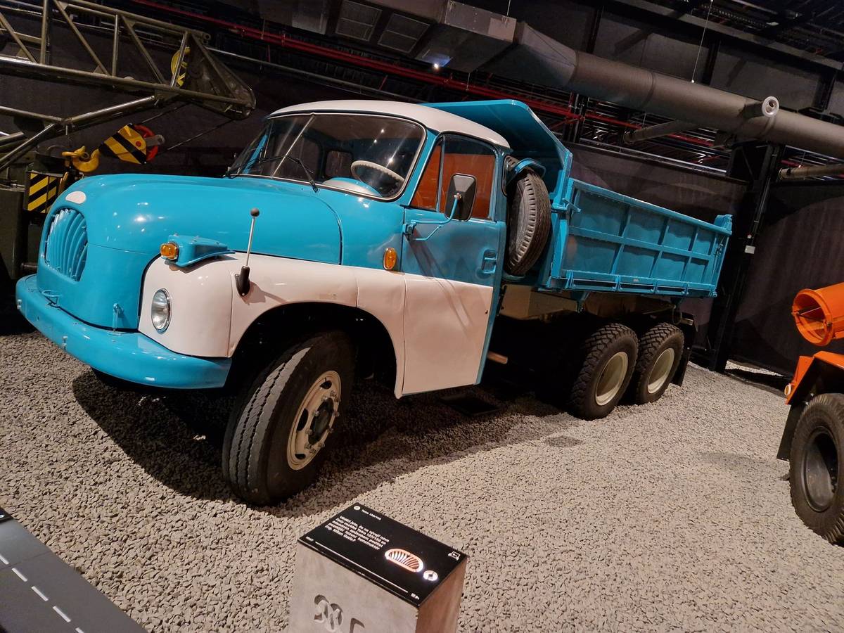 Pohled na expozici T815, která nahradila počátkem 80. let T148. Nechybí vojenské úpravy, ale třeba také auto, s nímž jezdil i automobilový závodník Emil Triner. To je ten červeno-žlutý jednostranný sklápěč.