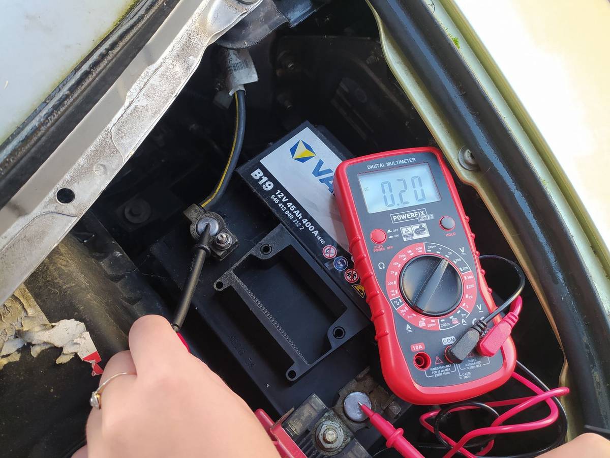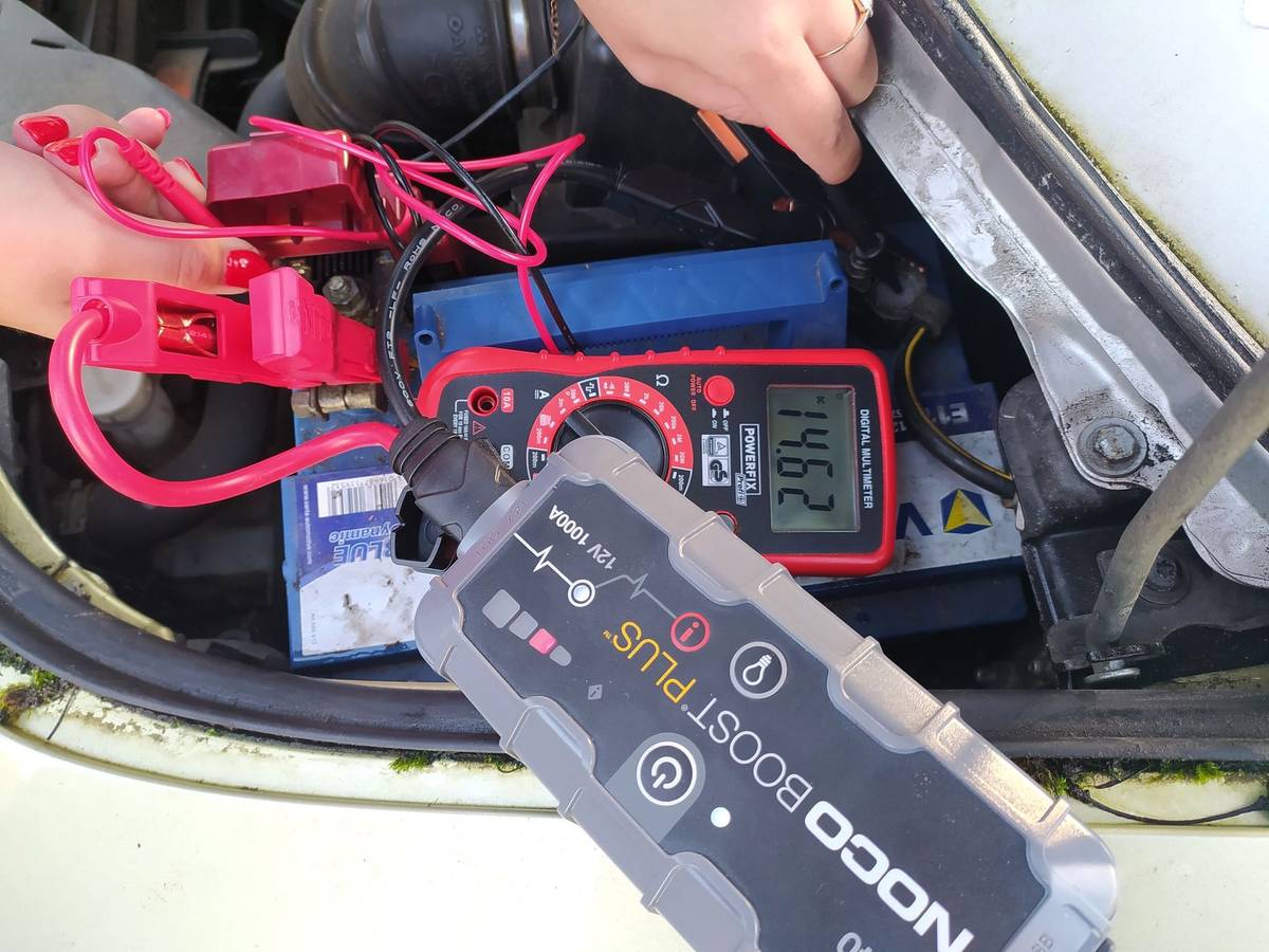 Tady už pracuje alternátor. Po nastartování napětí v baterii okamžitě stoupne.