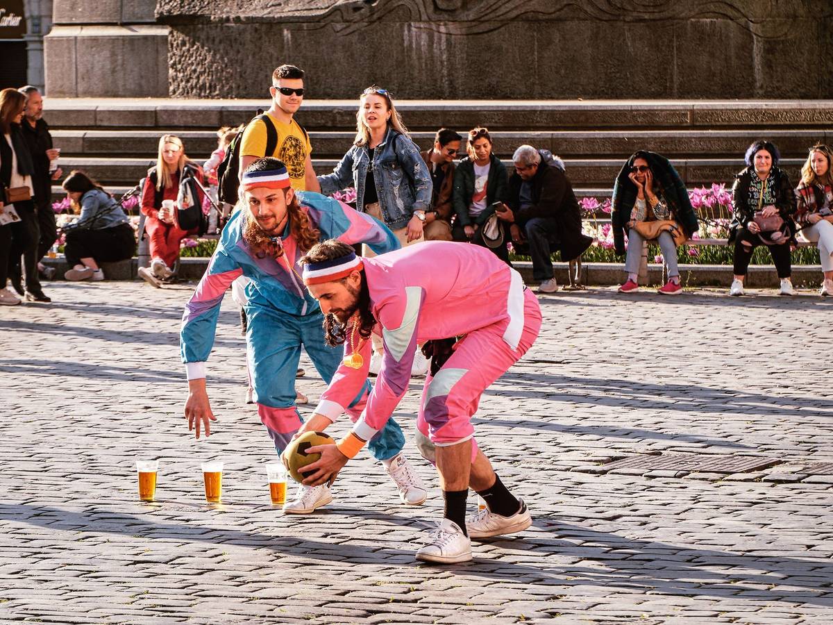 Lockdowny a uzavřené hranice byly rychle zapomenuty. První známkou toho, že se turistický ruch zase vrací, byly rozlučkové party zahraničních mladíků. Tady hrají na Staroměstském náměstí jakýsi pivní turnaj (duben 2022).