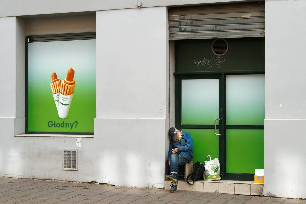 "Máš hlad?" ptá se nápis na výloze v polském Krakově (září 2022).