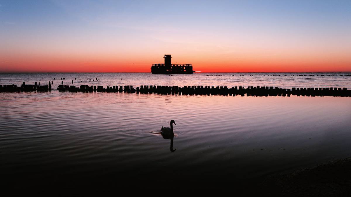 Labuť a torpedová stanice za svítání. Železobetonový skelet bývalého německého vojenského objektu ze II. světové války (Torpedownia) poblíž polského města Gdyně.