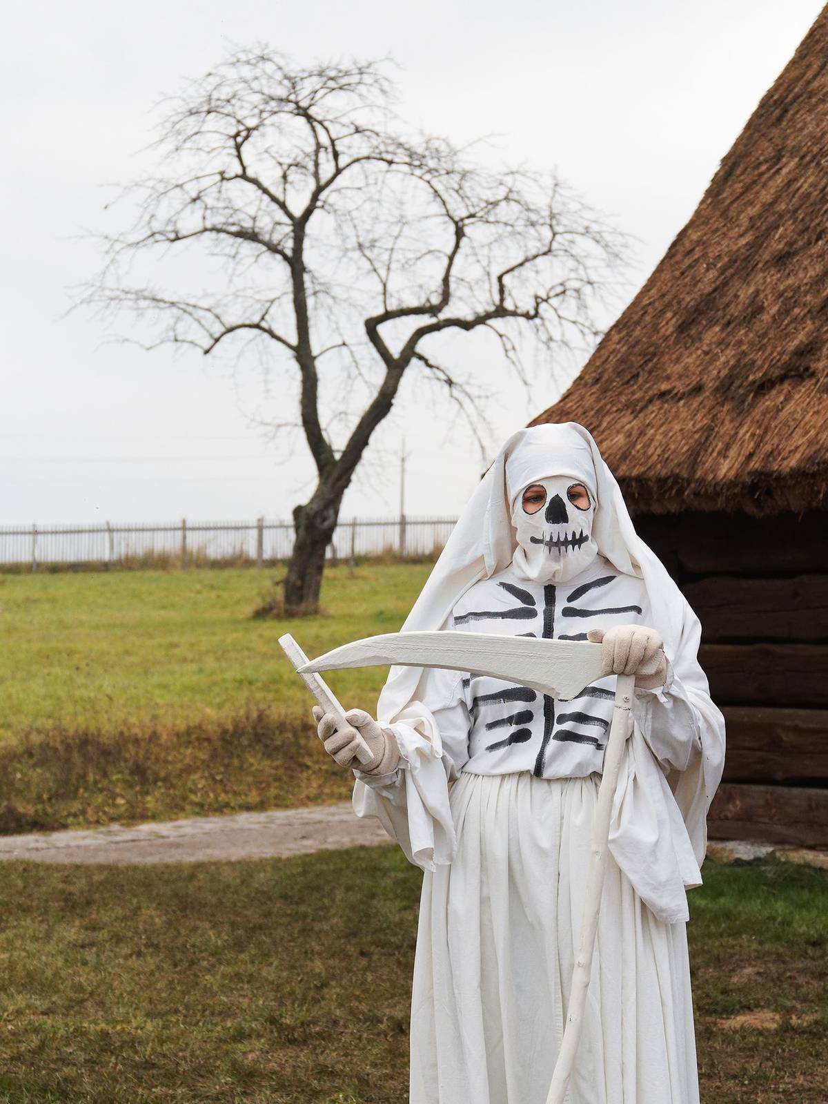 Smrtka. Jedna z postav svatomikulášské obchůzky v Muzeu lidových staveb v Kouřimi (prosinec 2022).