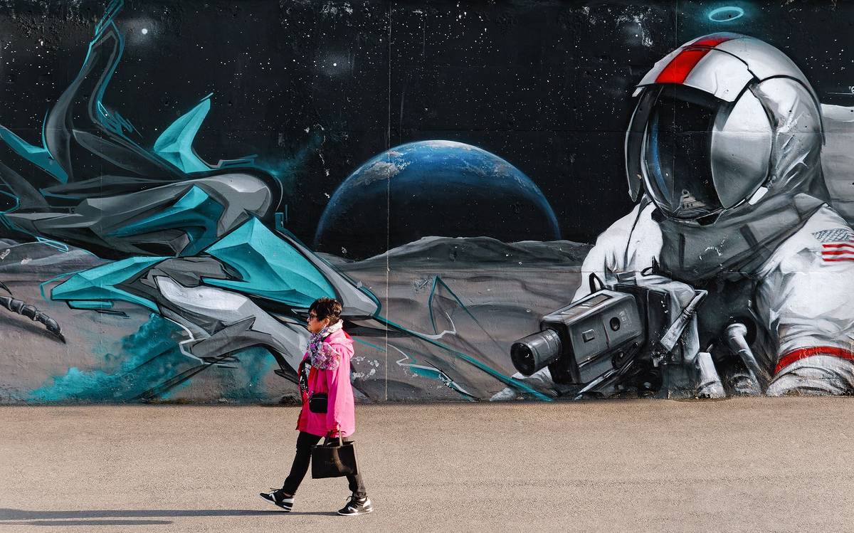 Ale pojďme od války k veselejším momentům. I těch bylo během roku dost. Tento snímek zachycuje ženu procházející kolem street artu nedaleko od sídla Czech Photo Centre v pražských Nových Butovicích (duben 2022).