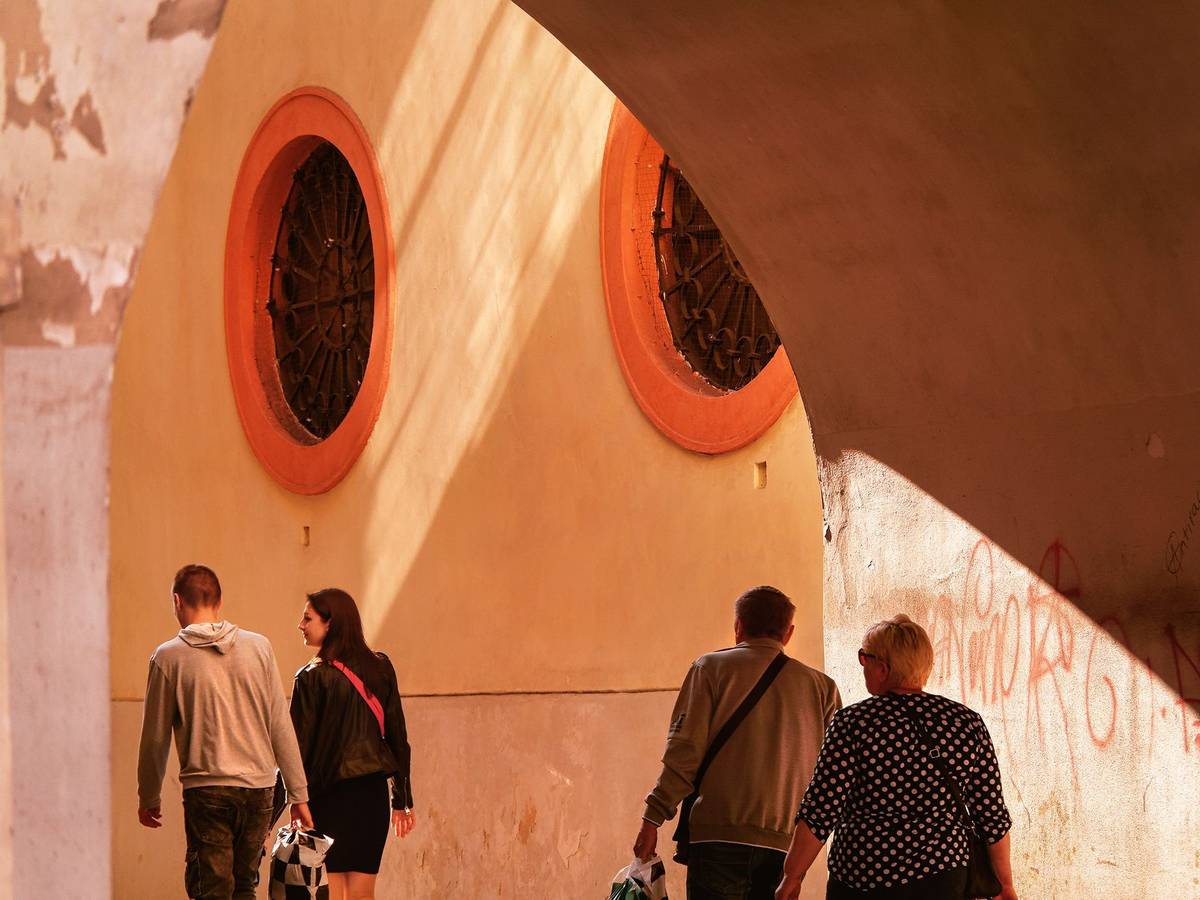 On a ona. Kdyby se ohlédli, možná uvidí sami sebe za čtyřicet let. Průjezd na Letenské ulici u kostela sv. Tomáše, duben 2022.