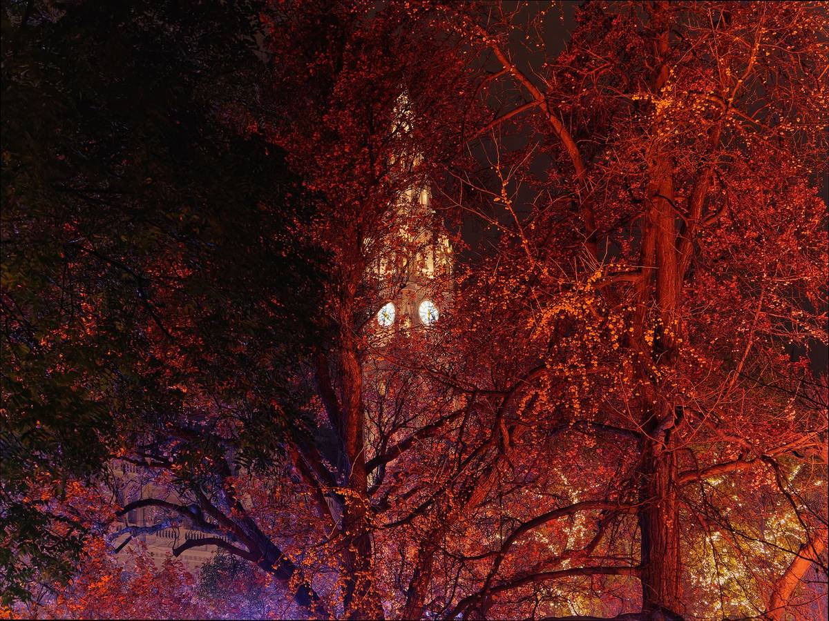 Vánočně osvětlený park před vídeňskou radnicí během prvního adventního týdne (listopad 2022).