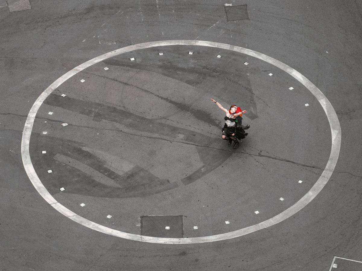 Radost. Účastnice pochodu Prague Pride tančí na kruhovém objezdu před Prašnou branou (srpen 2022).
