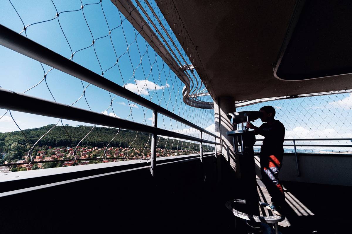 Ale přesuňme se z Prahy na chvíli někam jinam. Třeba na střechu Baťova mrakodrapu ve Zlíně, kde stany kreslily nádherné geometrické linie (červen 2022).