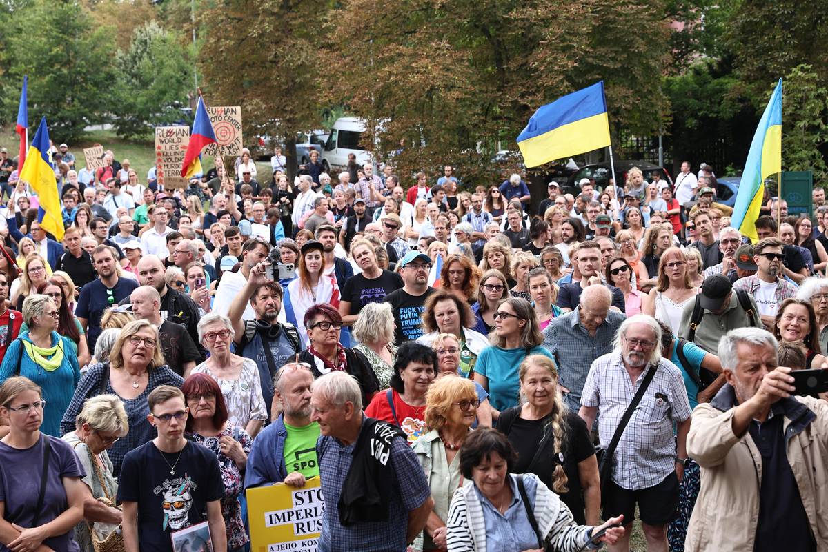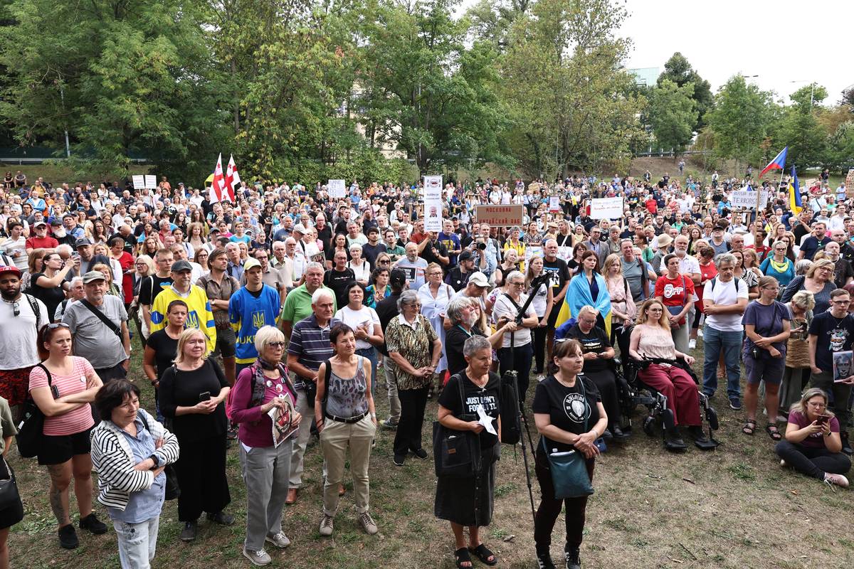 Stovky účastníků čtvrteční akce před ruskou ambasádou v Praze.