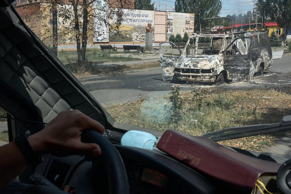 Zničená evakuační dodávka v Dobropillji na pokrovském úseku fronty.