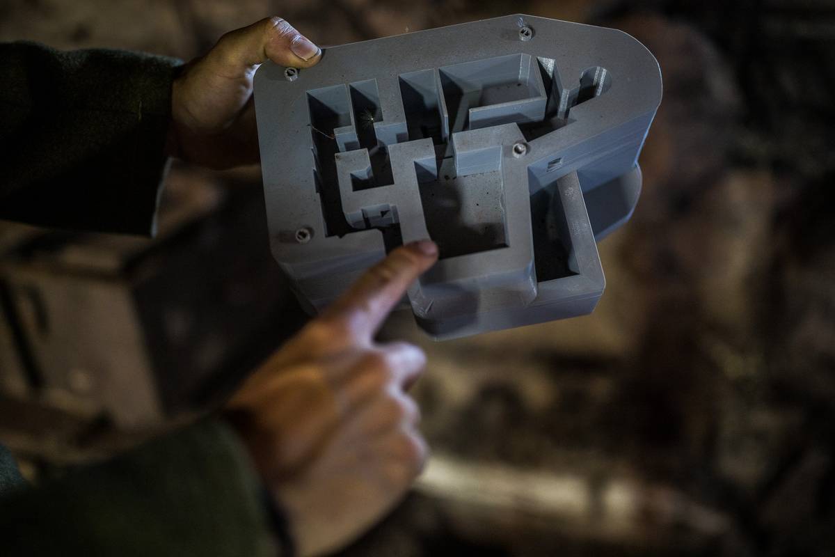Stojíme tady, ukazuje mladík na modelu bunkru.