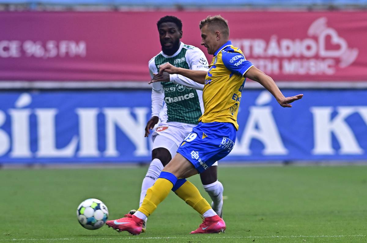Utkání 6. kola první fotbalové ligy: FK Teplice - FK Jablonec, do útoku se řítí hostující Alexis Alégué, kterého stíhá Nojus Audinis.