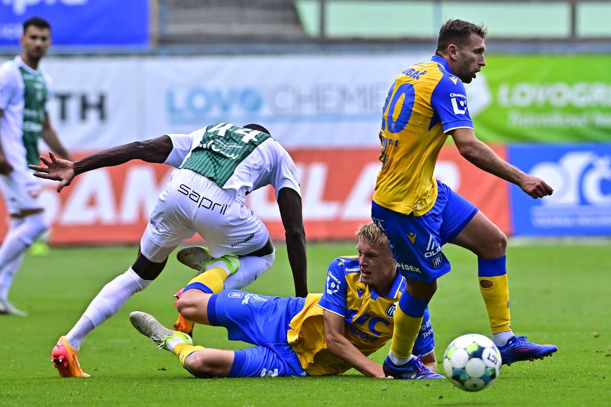 Utkání 6. kola první fotbalové ligy: FK Teplice - FK Jablonec, zleva hostující Lamin Jawo a domácí dvojice Nojus Audinis - Daniel Trubač