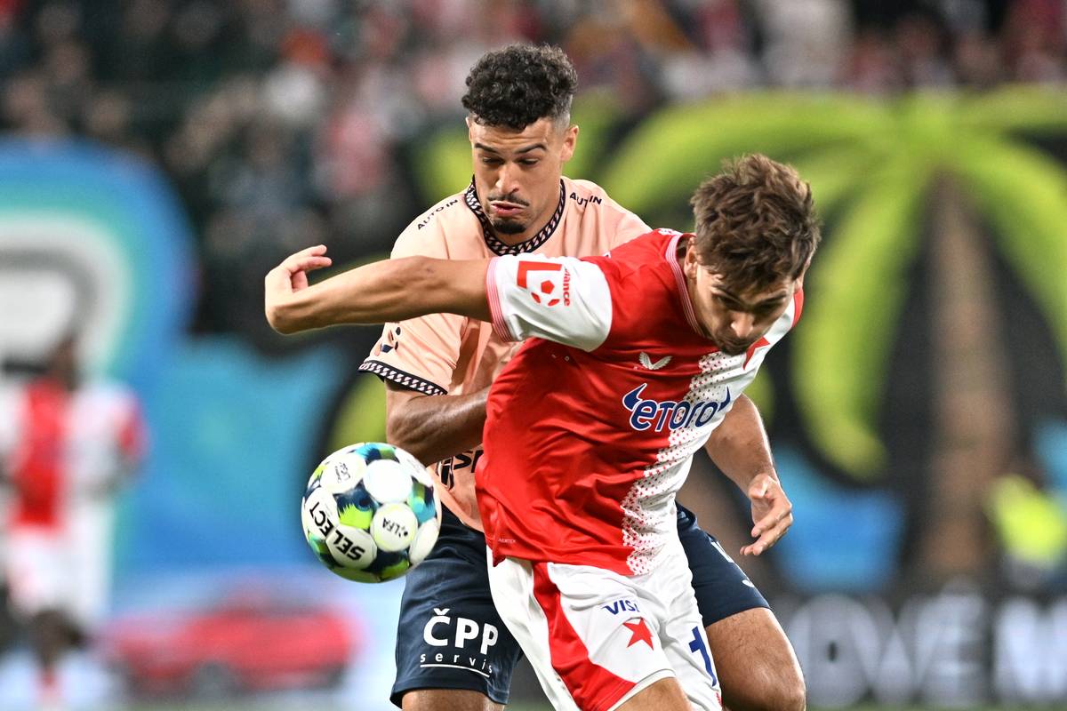 Jason Noslin z Pardubic v souboji s Mojmírem Chytilem ze Slavie