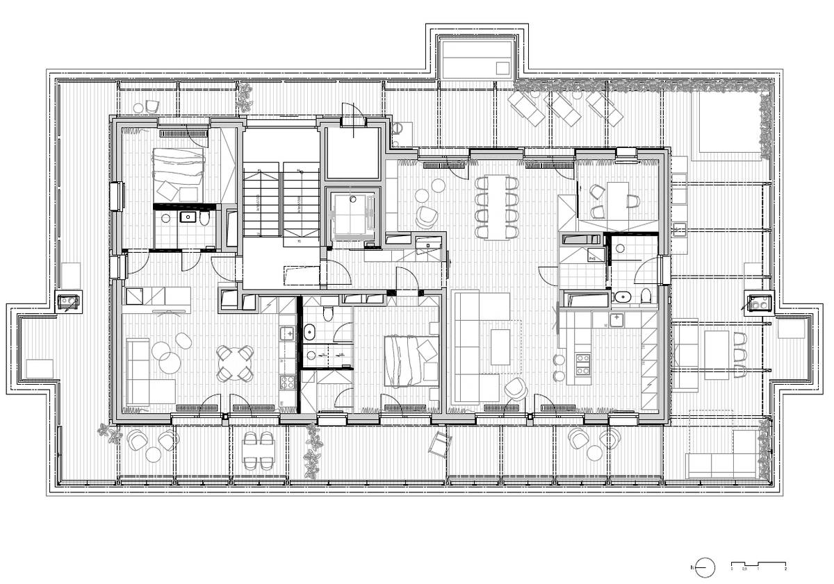 Společným prvkem obou střešních bytů je inteligentní systém, který řídí stínění, klimatizaci, osvětlení i integrované reproduktory. Rozdílné je použití mramoru: v menším bytě je ve světlém, přírodním odstínu.