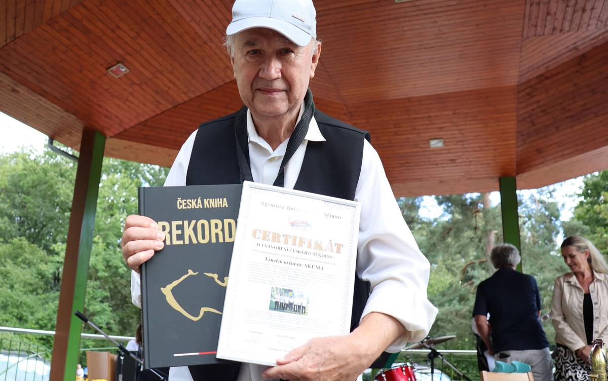 Saxofonista Aleš Gurecký ukazuje certifikát pelhřimovské Agentury Dobrý den a Českou knihu rekordů.