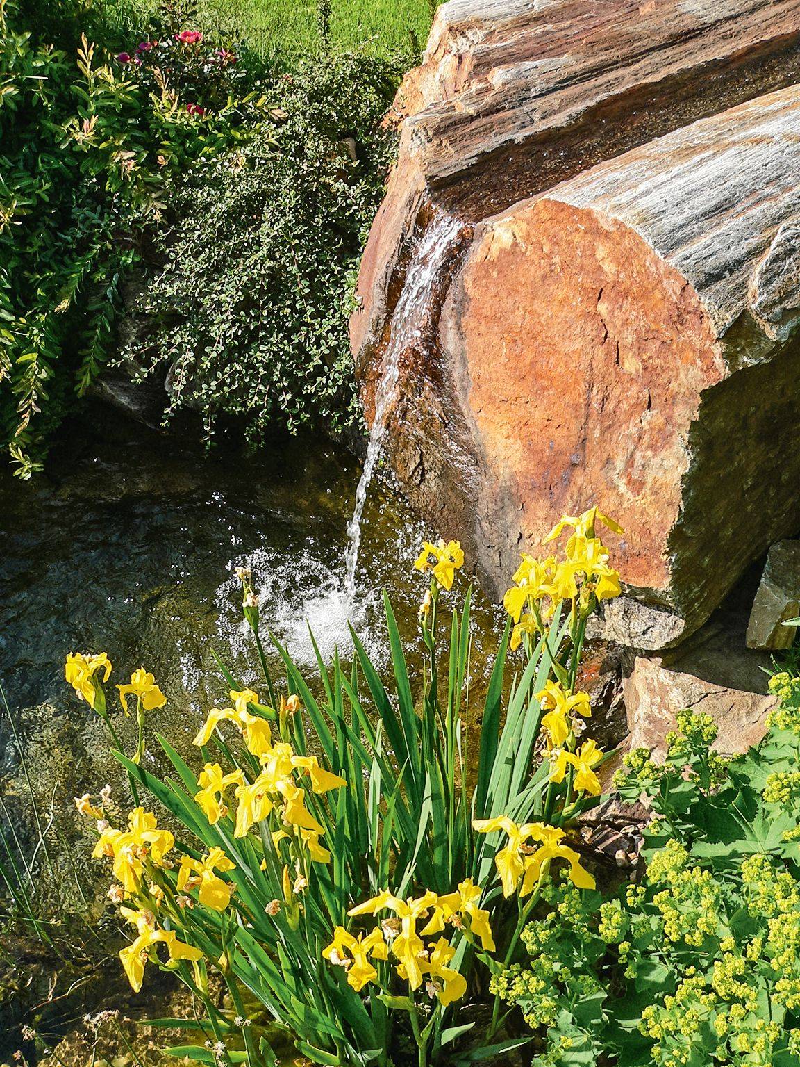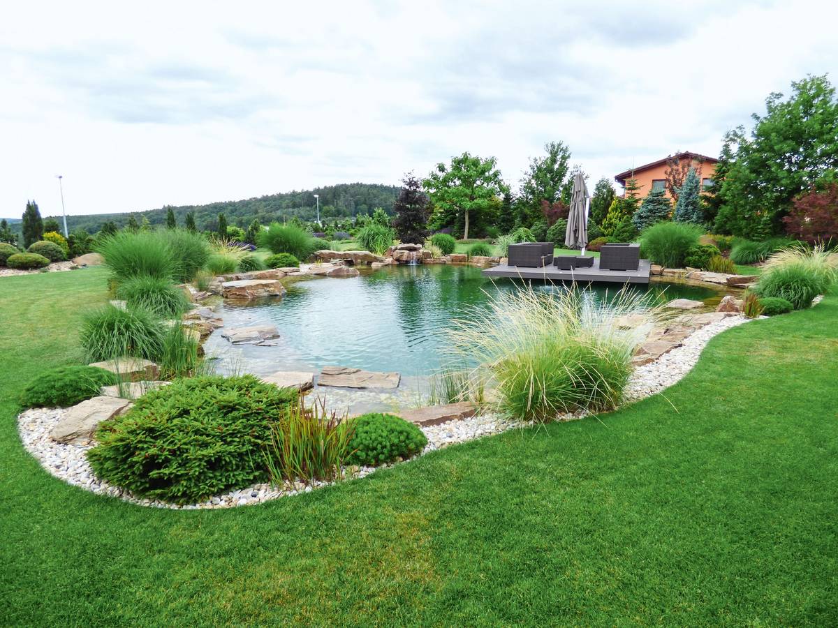 Okolí jezírka se pomocí rostlin přirozeně začlení do zbytku zahrady. Vedle okrasných travin tu najdeme i zakrslé formy jehličnanů, jako je smrk ‚Nidiformis‘ vlevo dole.