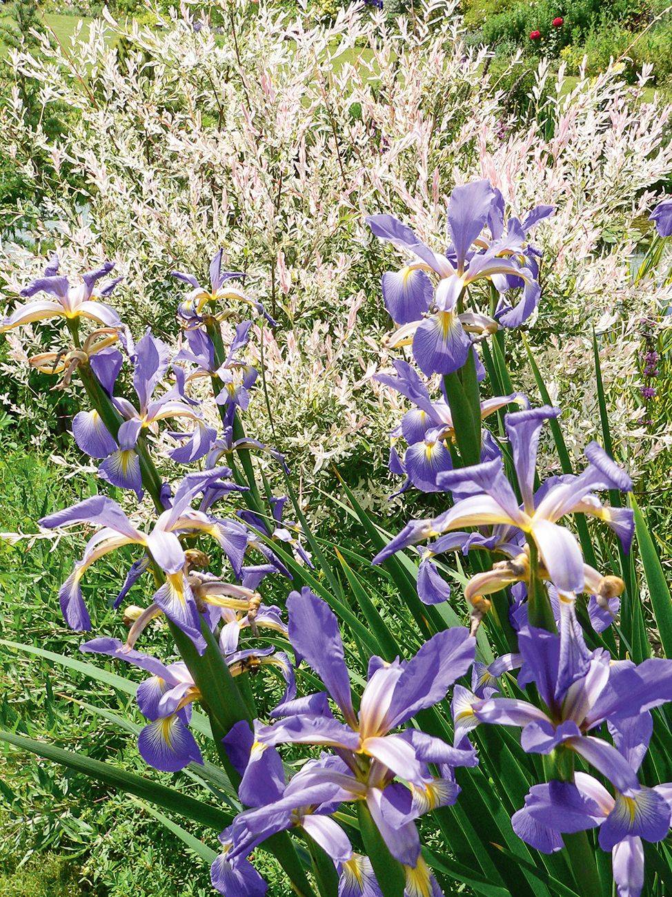 Kosatec (Iris versicolor) je rostlina, která má ráda vlhké až mokré prostředí. Za ní je známá japonská vrba ‚Hakuro-Nishiki‘.