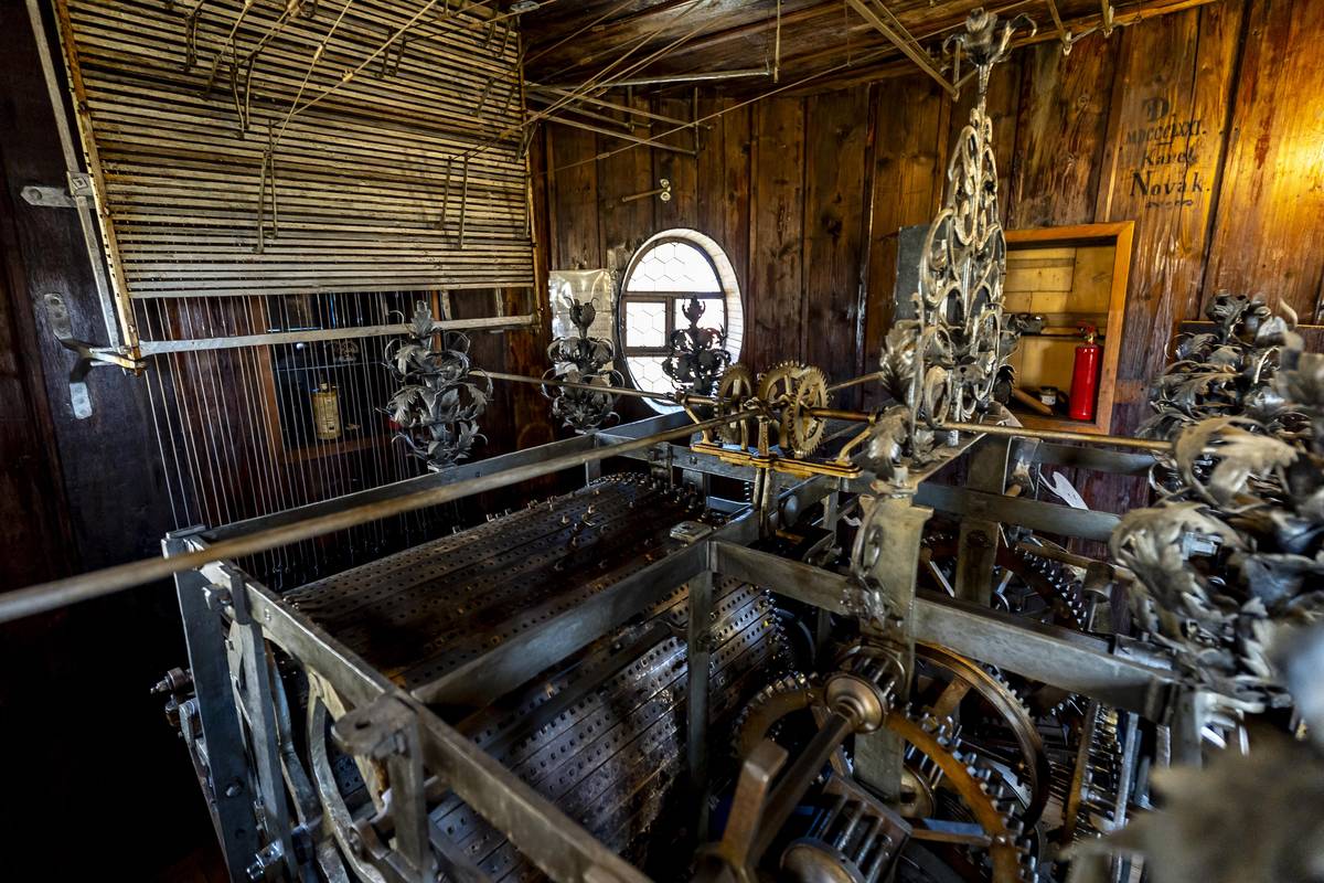 Hráč zvonkohry Radek Rejšek předvádí mechanismus, podle kterého zvonkohra hraje. Aktuálně je do něj nasazena skladba Maria, Maria, nad slunce jasnější.