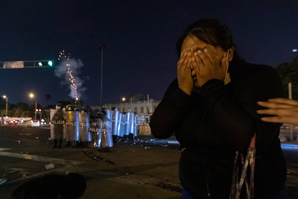 Na snímku si žena zakrývá oči po střelbě policistů slzným plynem, vyfoceno 23. ledna v Limě.