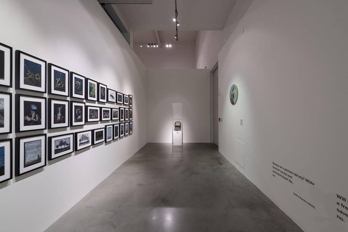 Pohled do výstavy Bolest těch druhých. Vpravo opět dílo Příchozí od Františka Nováka.