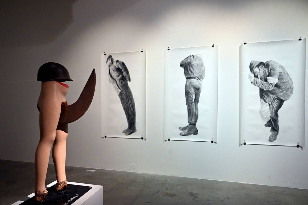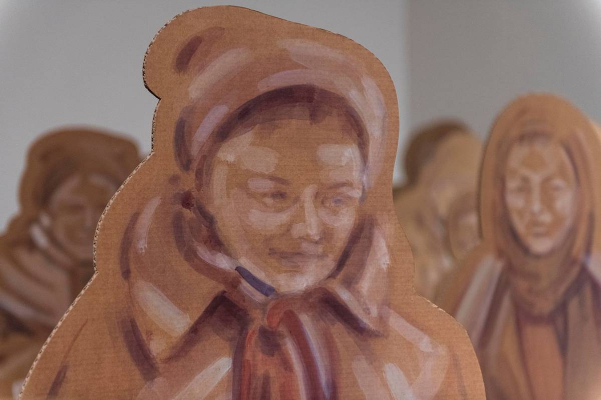 Na snímku z výstavy Bolest těch druhých je dílo Příchozí od Františka Nováka, který zohledňuje zkušenosti ze zaměstnání v azylovém centru pro lidi bez domova i tradici dřevěných betlémů.