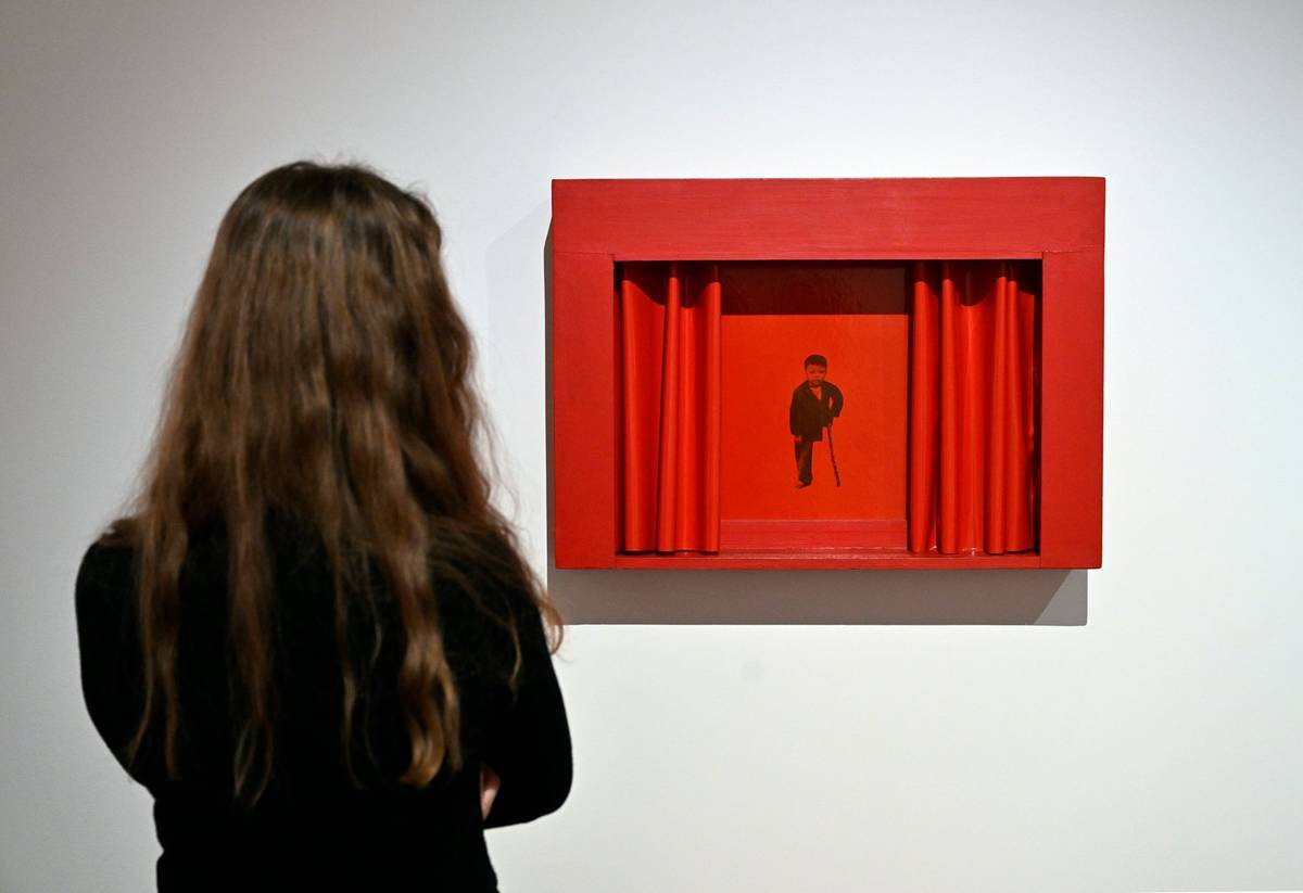 Diváky na výstavě vítají rudočerné fotografie seskládané do tvaru připomínajícího hákový kříž.
