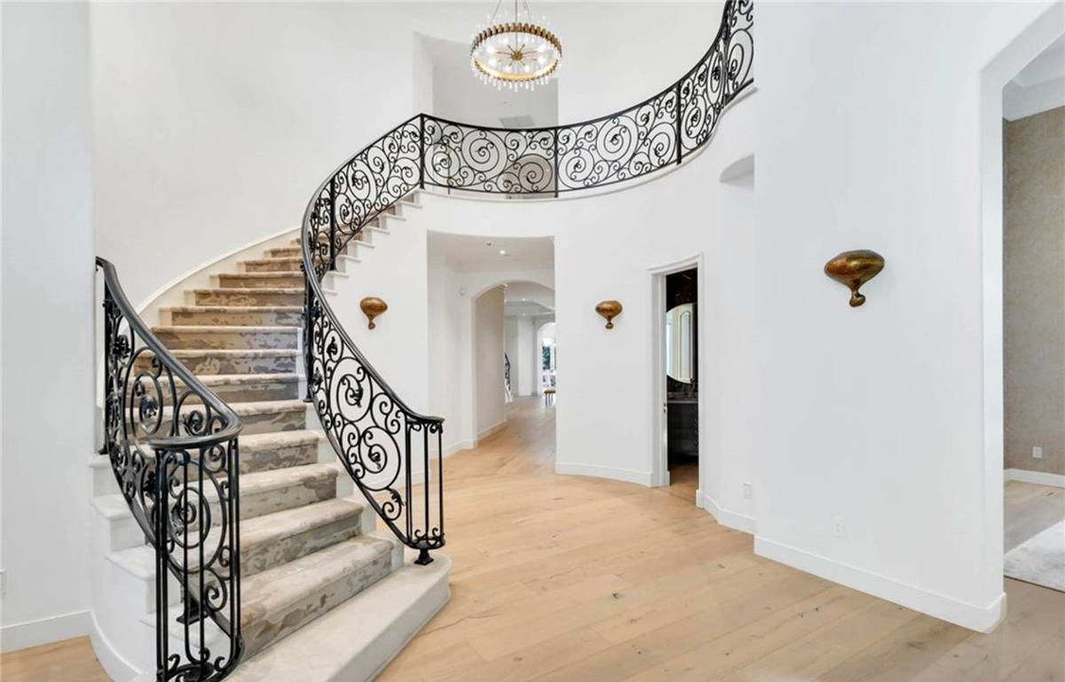Interiéru dominují světlé dubové podlahy a točité schodiště.