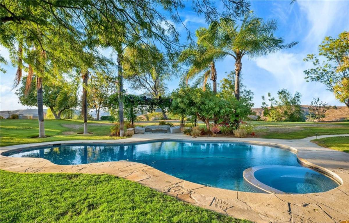 Veliký bazén s vířivkou obklopuje udržovaná zahrada.
