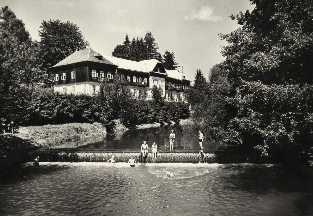 "Život tam byl skvělý a velmi rušný. Areál zůstal po válce v perfektním stavu, byl výborně vybavený a jeho návštěvnost obrovská," cituje kniha ze vzpomínek Helmuta Kaštovského (*1944), vnuka manželů Bogdanových – pracovníků zemědělského areálu Jánských Koupelí. Na snímku je zachycen společenský život rekreantů v Zotavovně ROH Mír. Nedatované foto (cca 1970 až 1980).