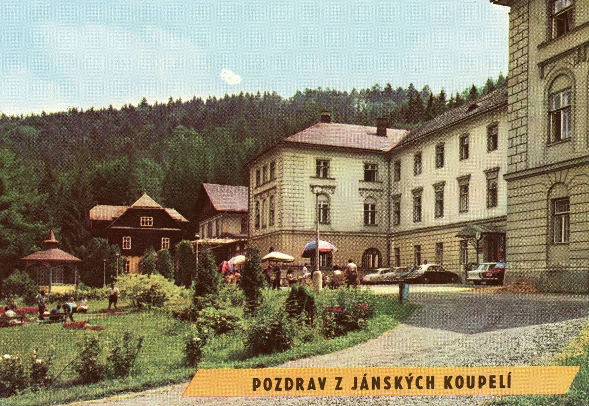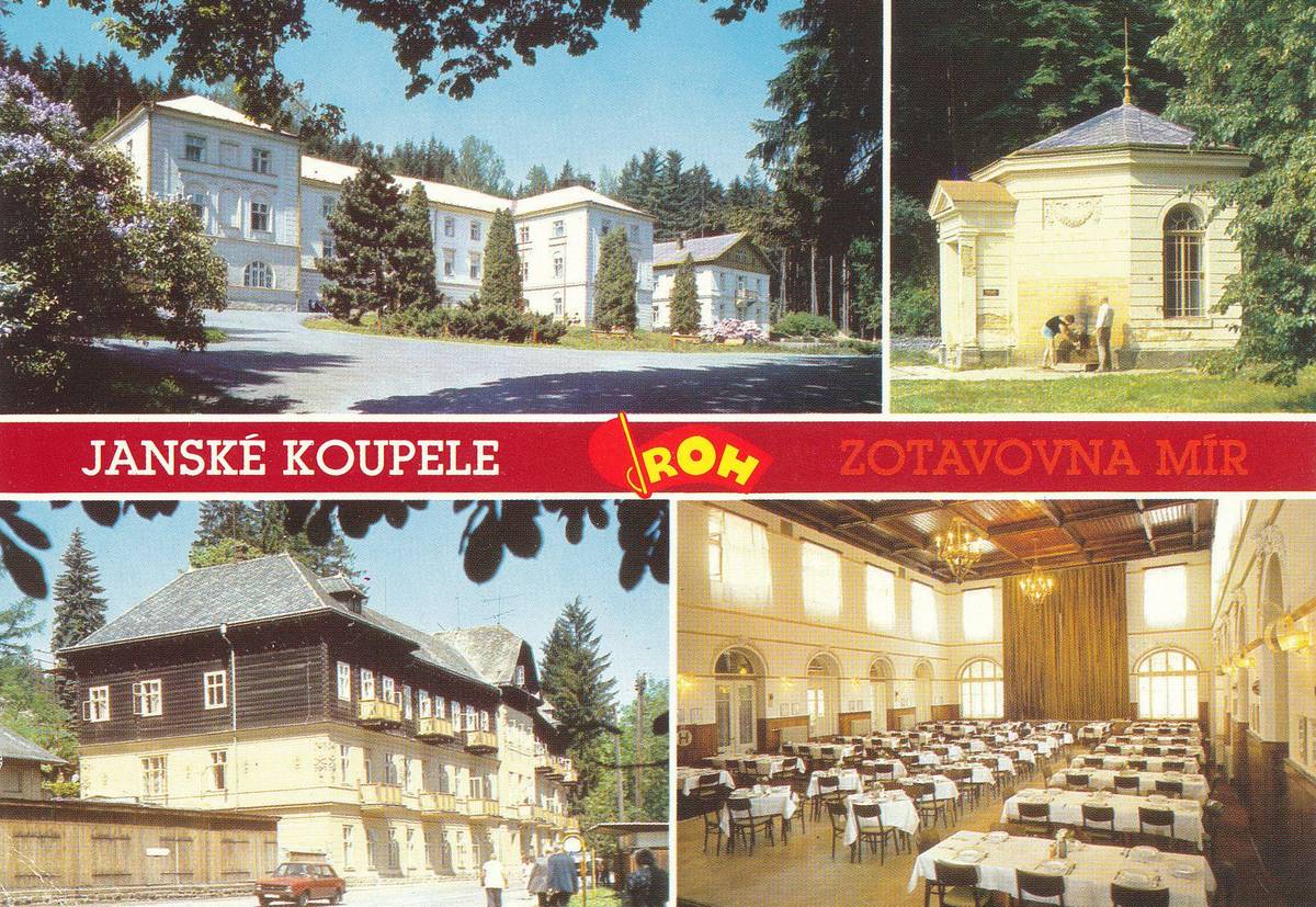 Areál bývalých lázní Jánské Koupele byl po nástupu komunistického režimu v roce 1948 přejmenován na Rekreační středisko ROH Mír nebo také na Zotavovnu ROH Mír. Na snímku je celkový pohled na areál. Nedatovaný snímek (cca 50. až 70. léta 20. století).