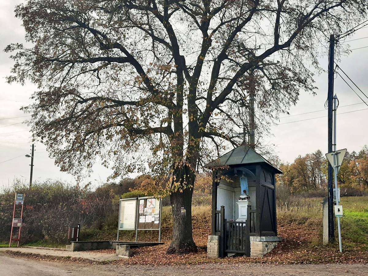 Kaplička se sochou Panny Marie a autobusová zastávka.