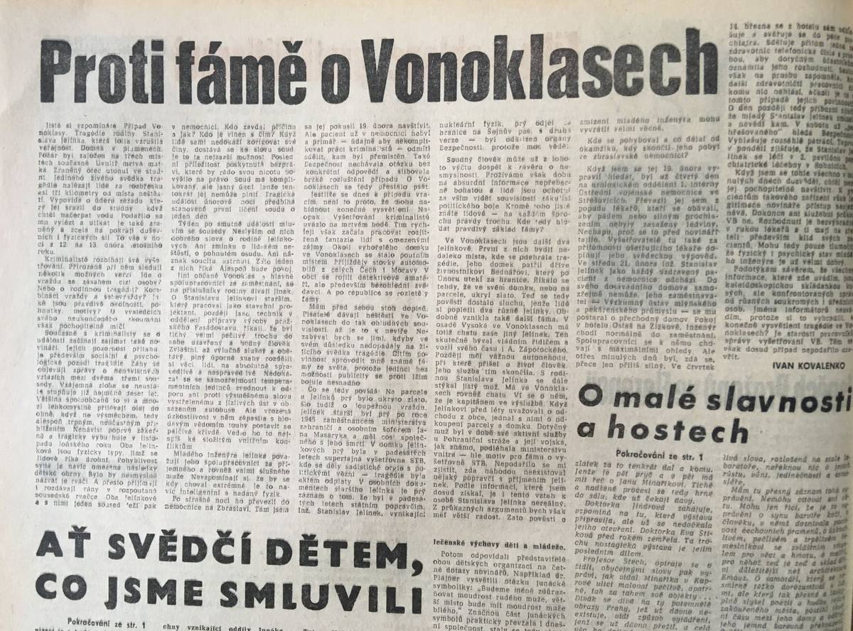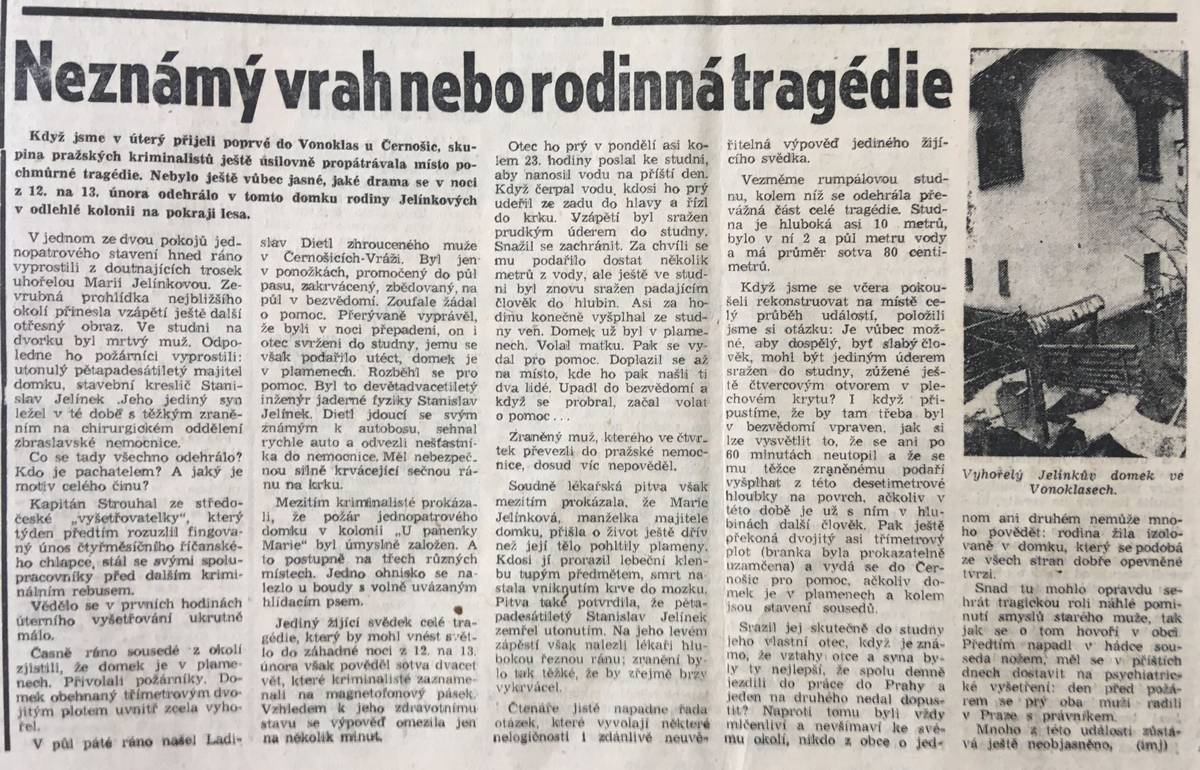 Ohořelé tělo Marie Jelínkové, která byla zavražděna ranami tupým předmětem do hlavy. Policejní fotografie z vyšetřování případu vraždy ve Vonoklasech, která byla publikovaná v roce 1968 v Kriminalistickém sborníku.
