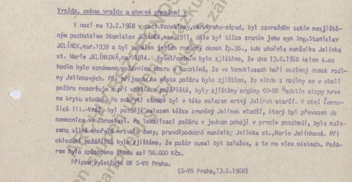 Zápis Obvodního oddělení Veřejné bezpečnosti v Radotíně po nahlášení požáru domku ve Vonoklasech a nálezu dvou těl.