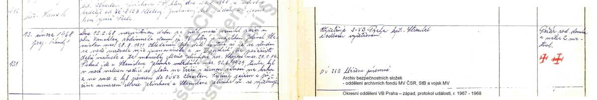 Zápis v dokumentu Obvodního oddělení Veřejné bezpečnosti v Radotíně po nahlášení rvačky dvou sousedů s Jelínkovými.