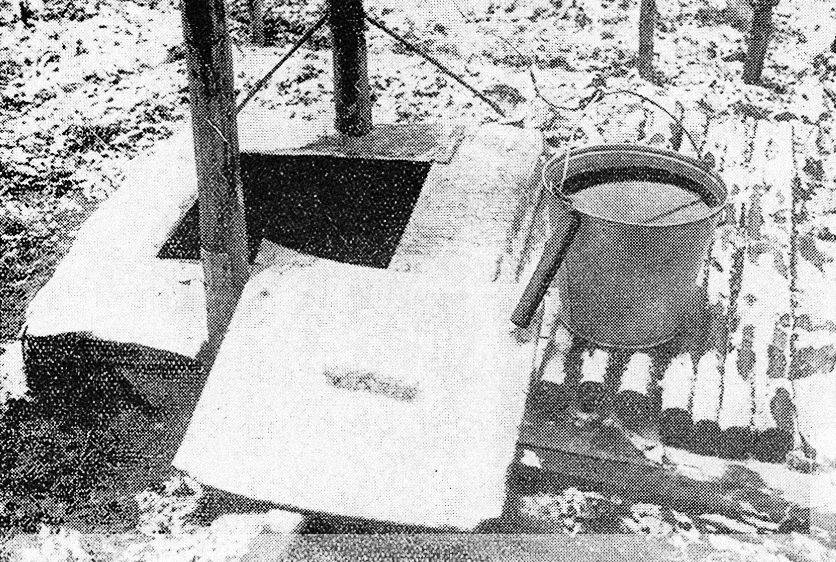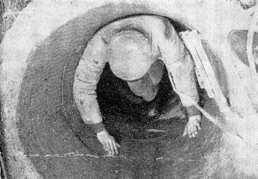 Záběr z vyšetřovacího pokusu. Hasič leze ze studny stejným způsobem, jako se z ní dostával Stanislav Jelínek ml. Profesionálovi cesta zabrala více než půldruhé hodiny. Policejní fotografie z vyšetřování případu vraždy ve Vonoklasech, která byla publikovaná v roce 1968 v Kriminalistickém sborníku.