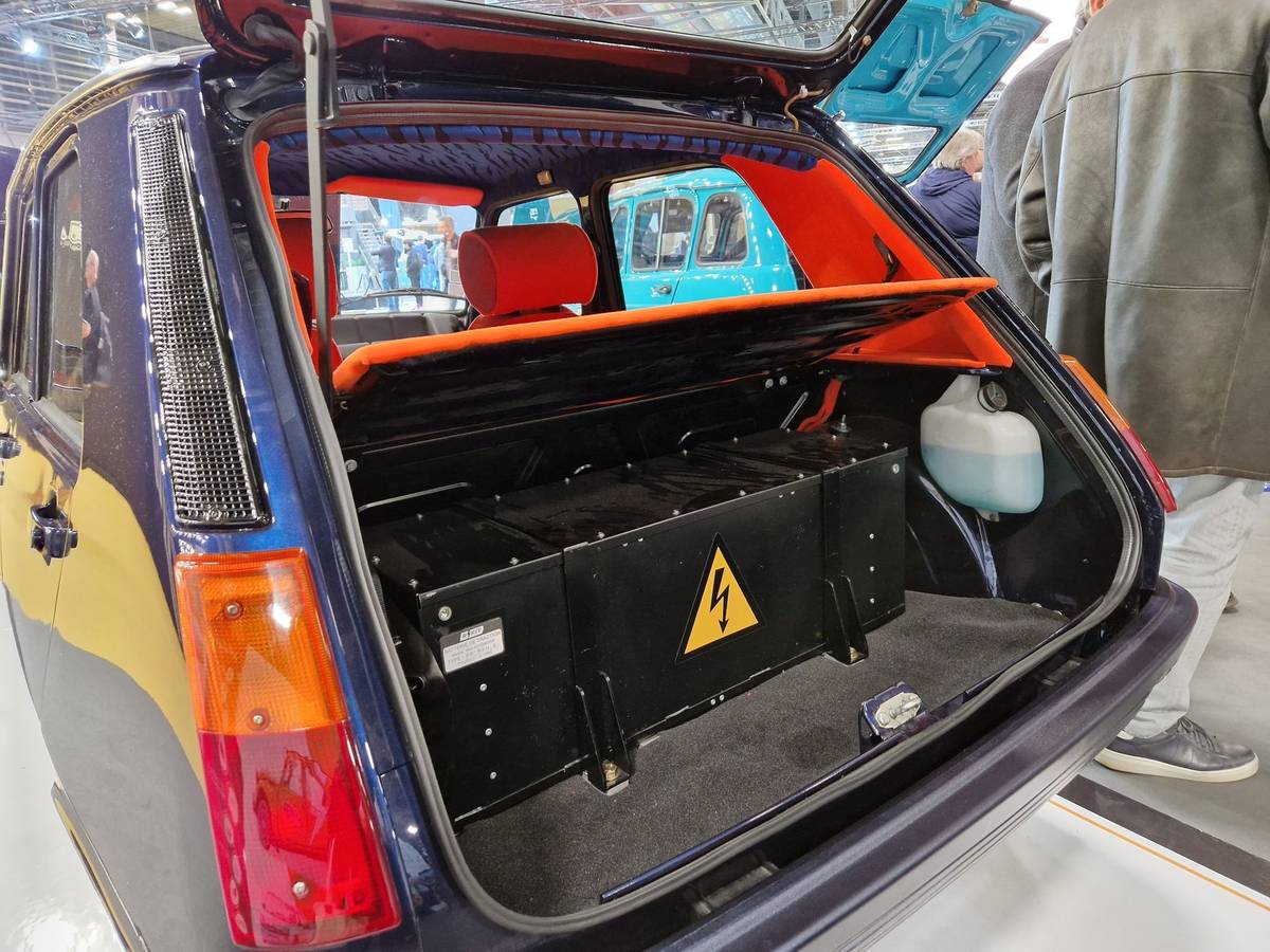 Baterie v útrobách elektrifikovaného Renaultu 5 je uložená v kufru. Jeho data zatím známá nejsou, lze ale čekat, že budou podobná jako u R4, který má 10,7 kWh akumulátor, výkon 48 kW a dojezd asi 80 km. Plně nabitá je baterka za tři a půl hodiny.