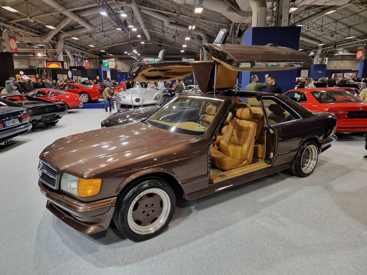 Hodně pozornosti vzbuzovala celá kolekce speciálně upravených Mercedesů Prominentní místo měl především tento model s racčími dveřmi, model 500 SGS Gullwing, který na základech modelu 500 SEC vytvořil německý úpravce SGS jako poctu původnímu "gullwingu", modelu 300 SL. Počátkem 80. let vzniklo podobných aut jen 57, toto konkrétní navíc ve velmi excentrické kombinaci hnědého laku a zlatého interiéru.