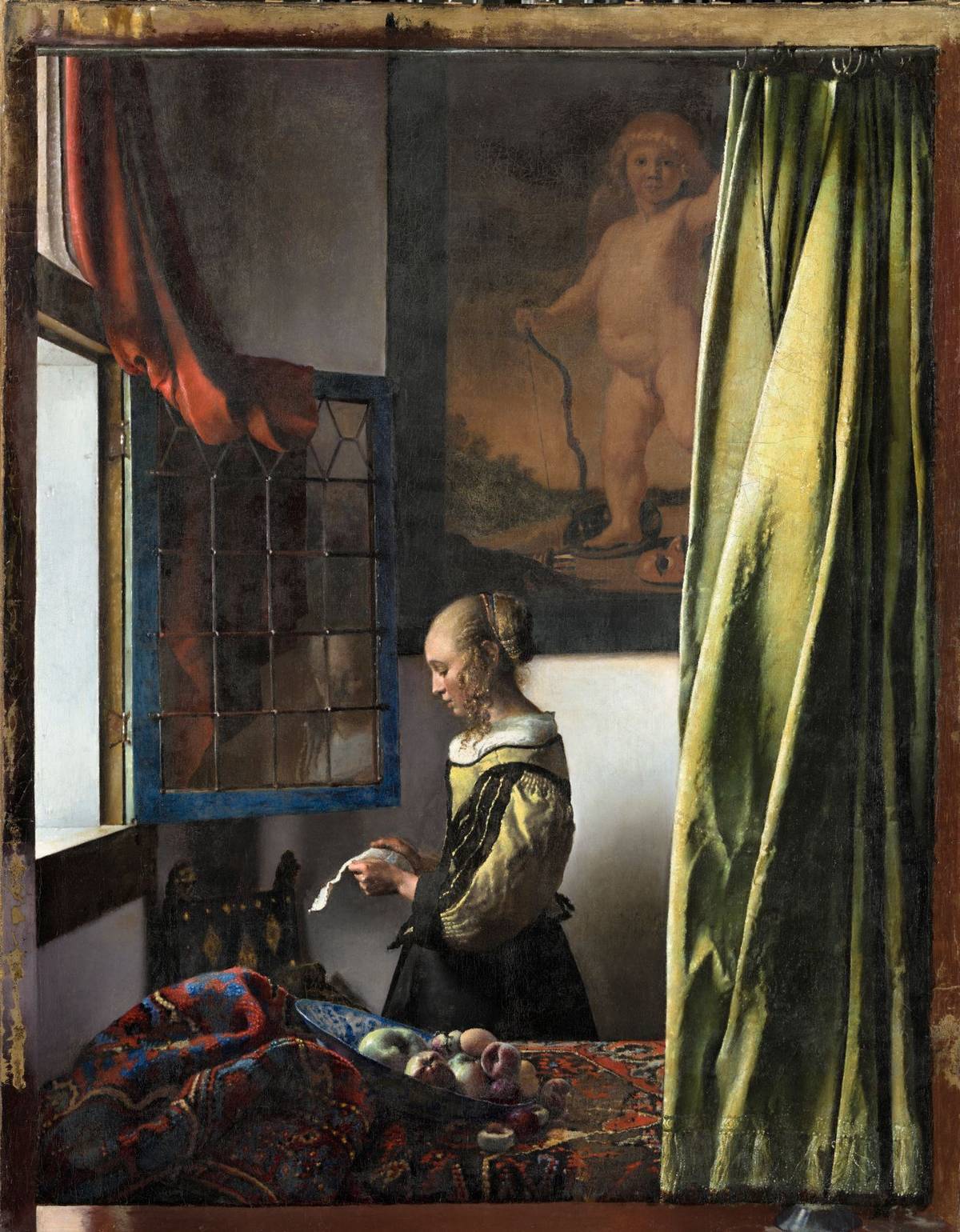 Návštěvnice výstavy si fotí Dívku u okna čtoucí dopis z roku 1657, kterou na výstavu zapůjčila Galerie starých mistrů v drážďanském Zwingeru.