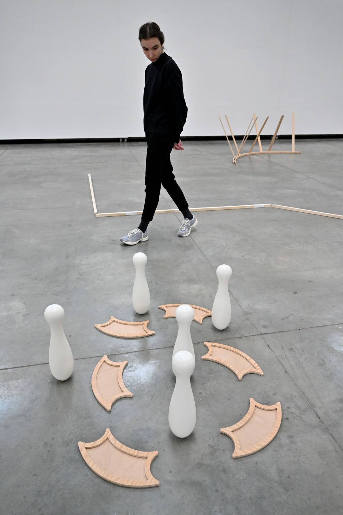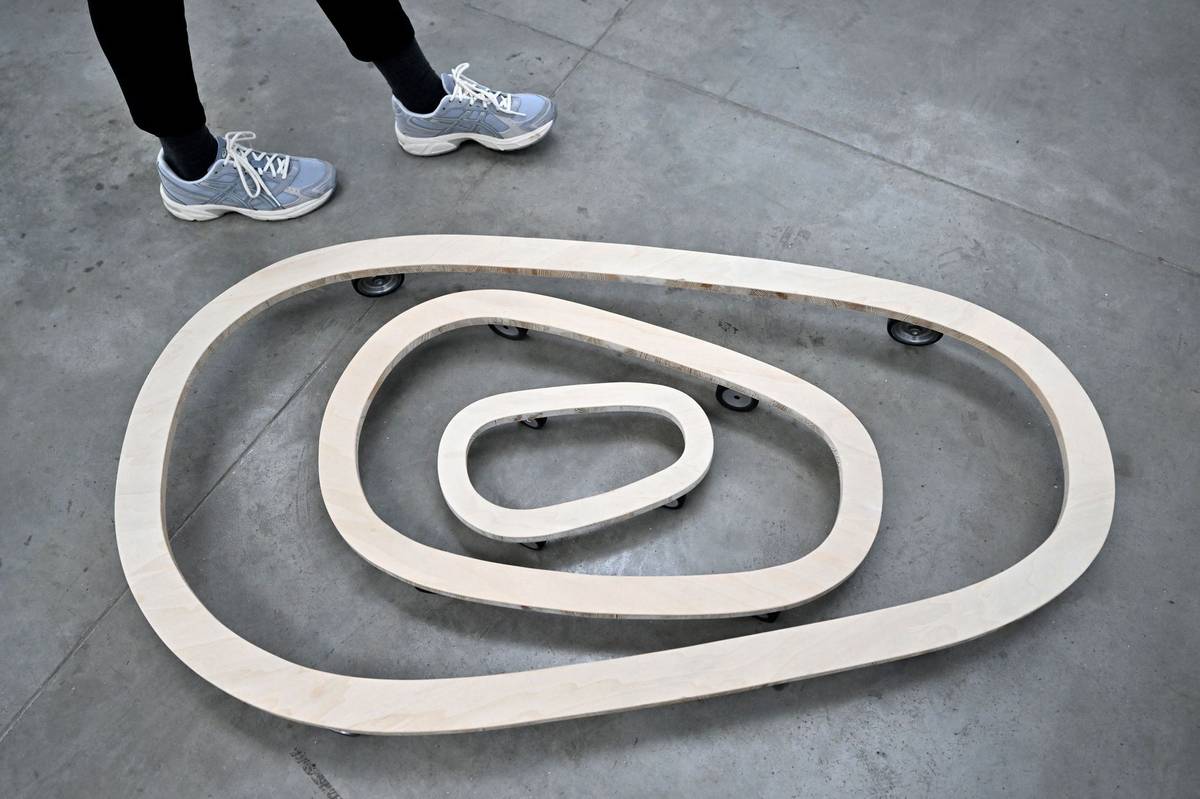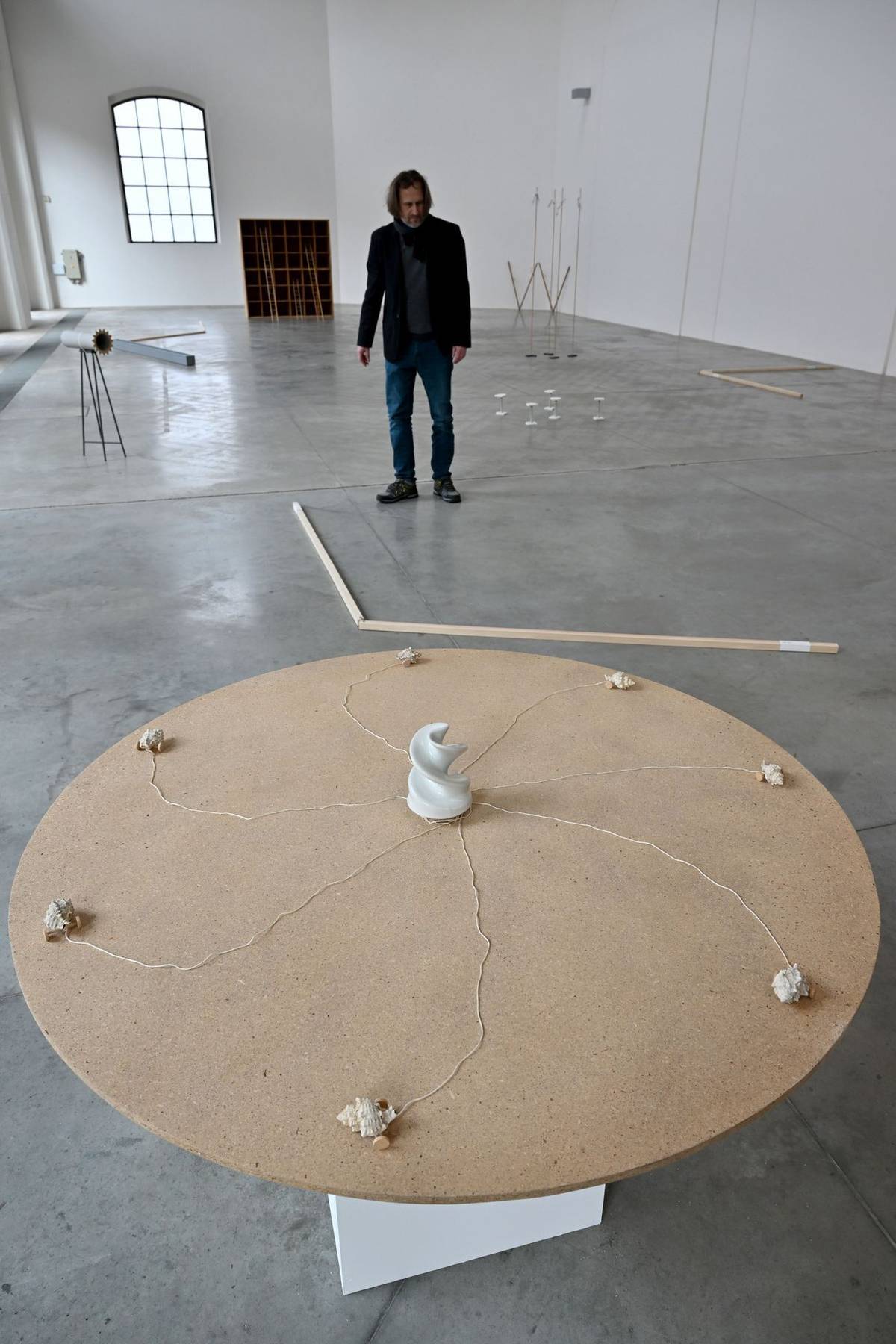 Tomáš Hlavina na výstavě svých děl, v popředí je jeho Kolotoč z roku 2001.