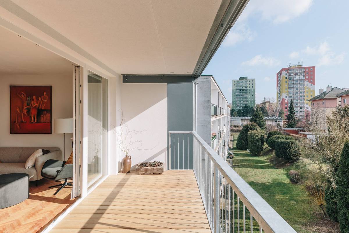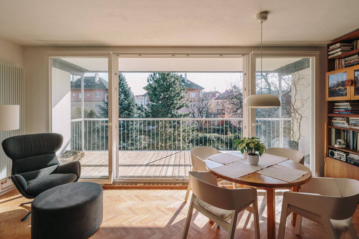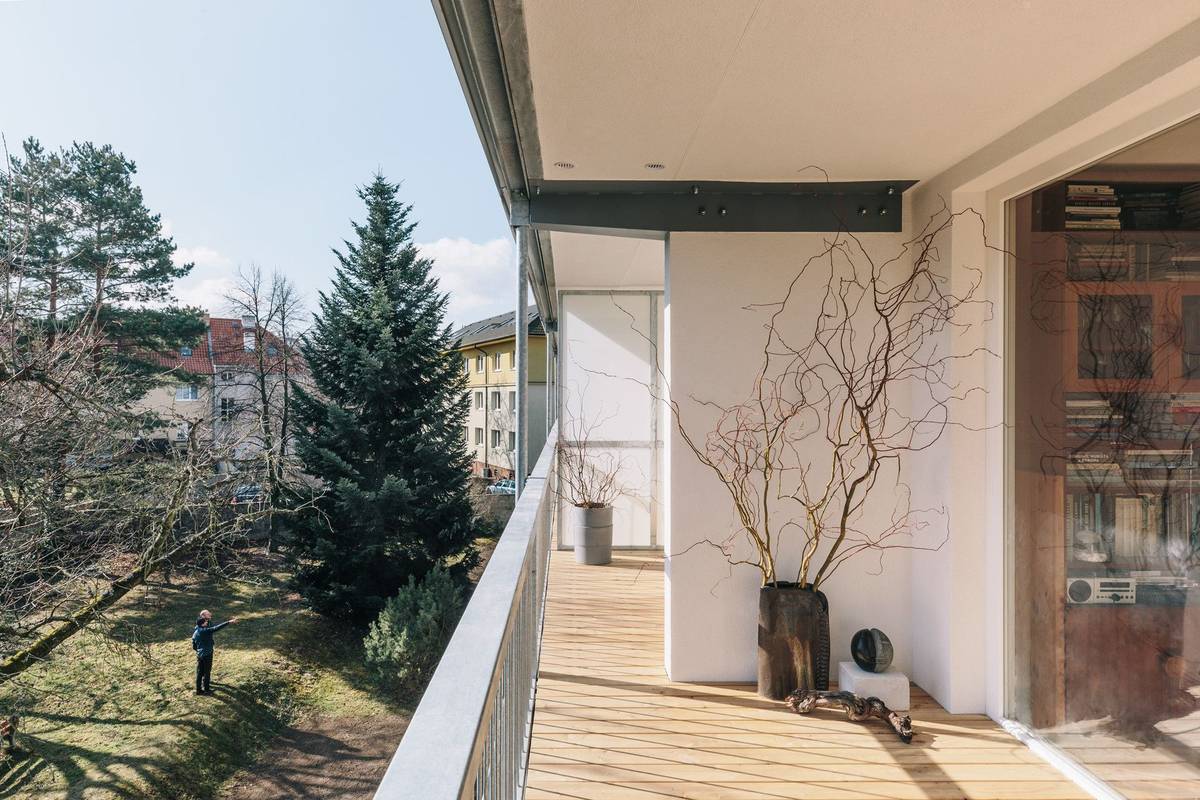 "Vlastníci jednotek si sami volili, jestli chtějí snížit parapety a zda chtějí mít přímý vstup na zahradu. S výjimkou vybourání parapetů některých bytů ale zůstala původní konstrukce domu nedotčena. Z materiálů na podlahy lodžií zvítězilo modřínové dřevo," říkají autoři proměny.