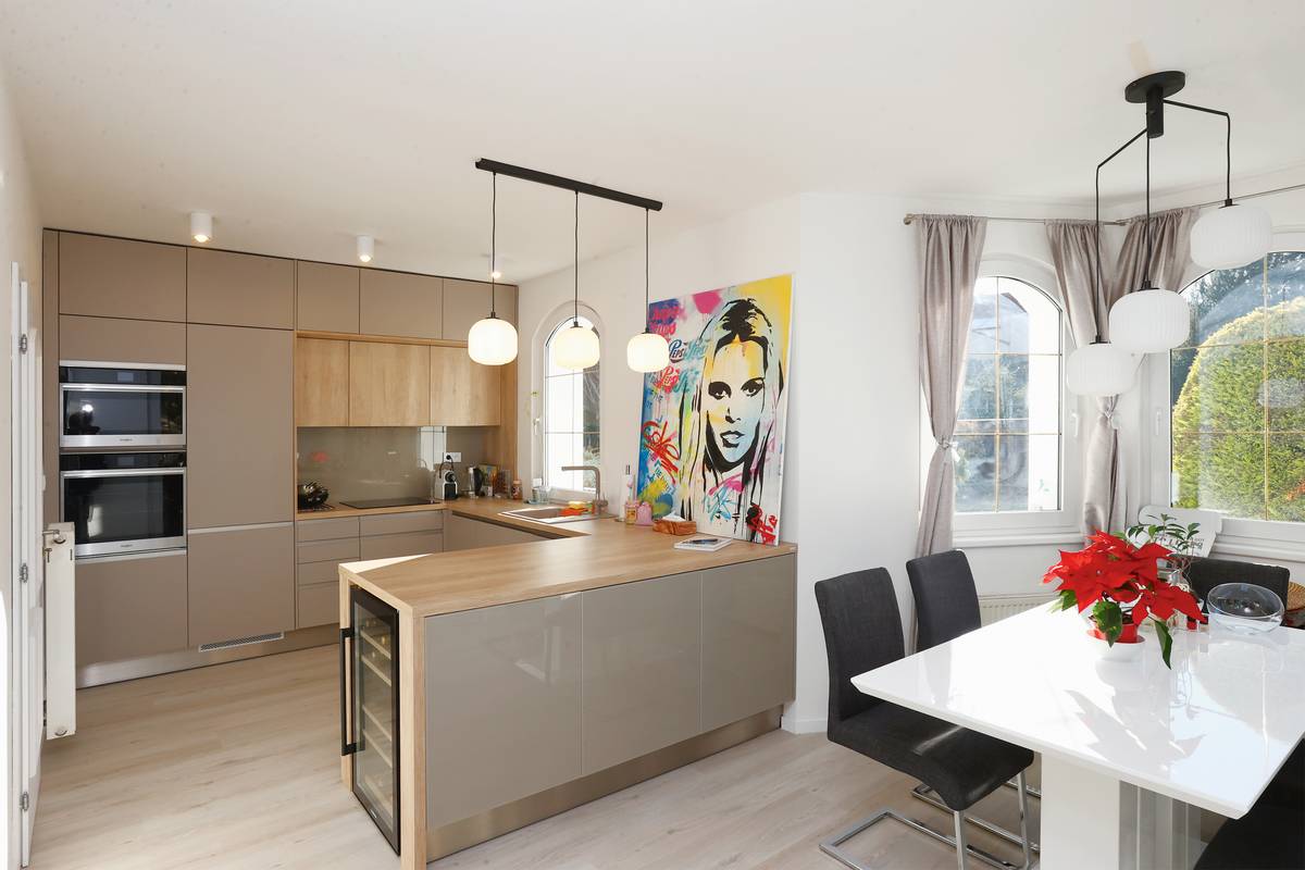 Skleněné desky na dvířkách z jedné strany pultu i za linkou usnadňují údržbu. „Elektroinstalace je nová, protože původně tu byl jeden lustr uprostřed.“ A portrét partnerky je od známého autora street artu.