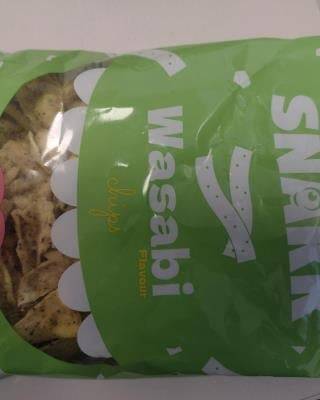 Snakk Wasabi chips, smažený hrachový snack s příchutí wasabi, kontrolováno v Globusu Pardubice, prosinec 2022. Chuť a vůně výrobku byly po žluknutí tuků. Potravina se nepovažuje za bezpečnou, pokud jeví známky kažení. Výrobek neměl prošlé datum minimální trvanlivosti.