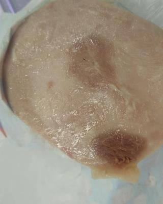 Kuřecí šunka, prodejce Jednota Ostřešany. Potravina zapáchala po kažení a měla lepkavý a oslizlý povrch. Potravina se nepovažuje za bezpečnou, pokud jeví známky kažení. Leden 2023.