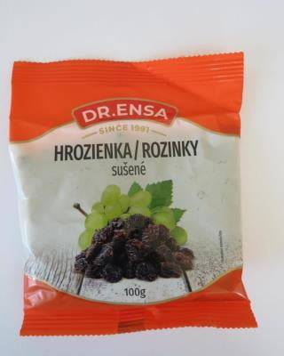 DR.ENSA Rozinky sušené, slovenský výrobce. Potravina obsahovala minerální olej, který není potravinářskou přídatnou látkou, a nesmí být tudíž v potravinách obsažen. Červen 2022.