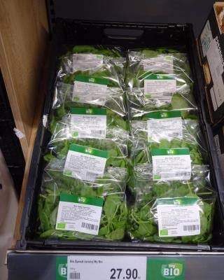 Bio baby špenát, dovoz z Itálie. Ve špenátu byl překročen maximální limit pro obsah dusičnanů. Penny Rumburk, září 2022.
