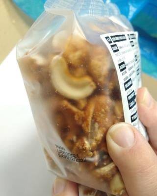 Allnature Kešu jádra v medu a chilli á 250 g; Balení byla uložena v kartonové krabici, která měla na povrchu a uvnitř stopy po působení škůdců, pavučinky, uhynulé jednice a přes průhledné obaly potravin bylo zjištěno, že uvnitř některých balení potravin jsou viditelné známky působení škůdců: pavučinky, kukly, živé housenky a také živý dospělec. Listopad 2022