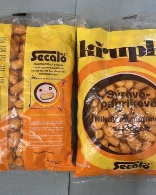 Křupky, sýrovo-paprikové. Uvnitř výrobku byl zjištěn výskyt škůdců v různých vývojových stádiích (housenky, zámotky, dospělci). Na regále, kde byla potravina nabízena k prodeji, nebyl zjištěn výskyt škůdců. Billa, Pardubice, říjen 2022