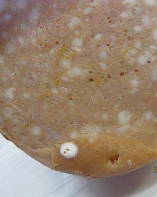 Houskový knedlík, červenec 2022. Na povrchu potraviny se vyskytovaly kolonie plísní okem viditelné. Potravina měla prošlé datum použitelnosti. Kemp Doksy, Staré Splavy